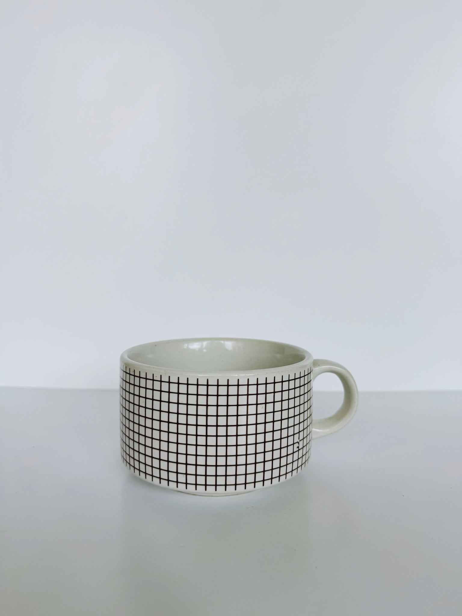 Chocolate brown grid patterned soup mug. From the 1980s.