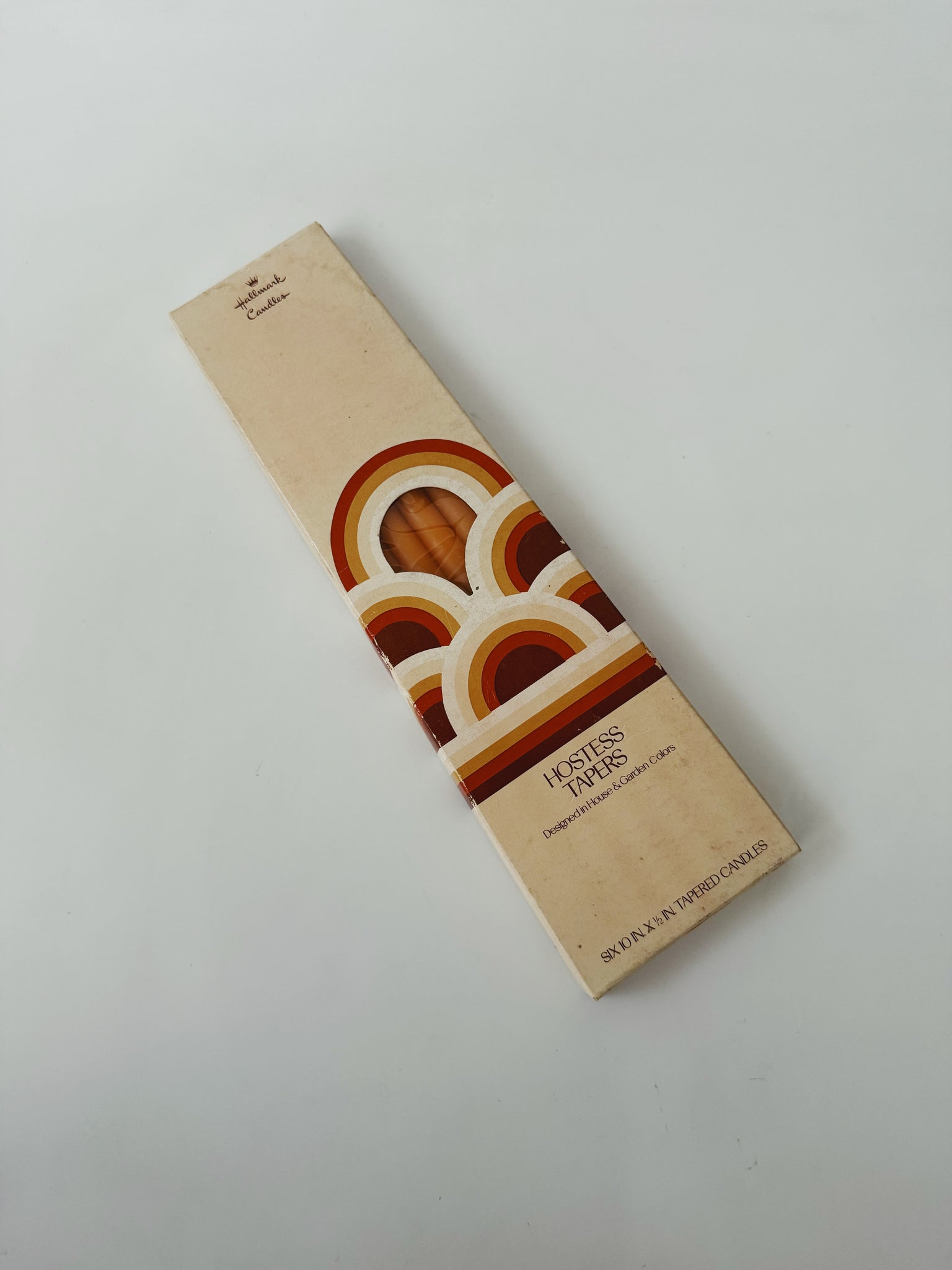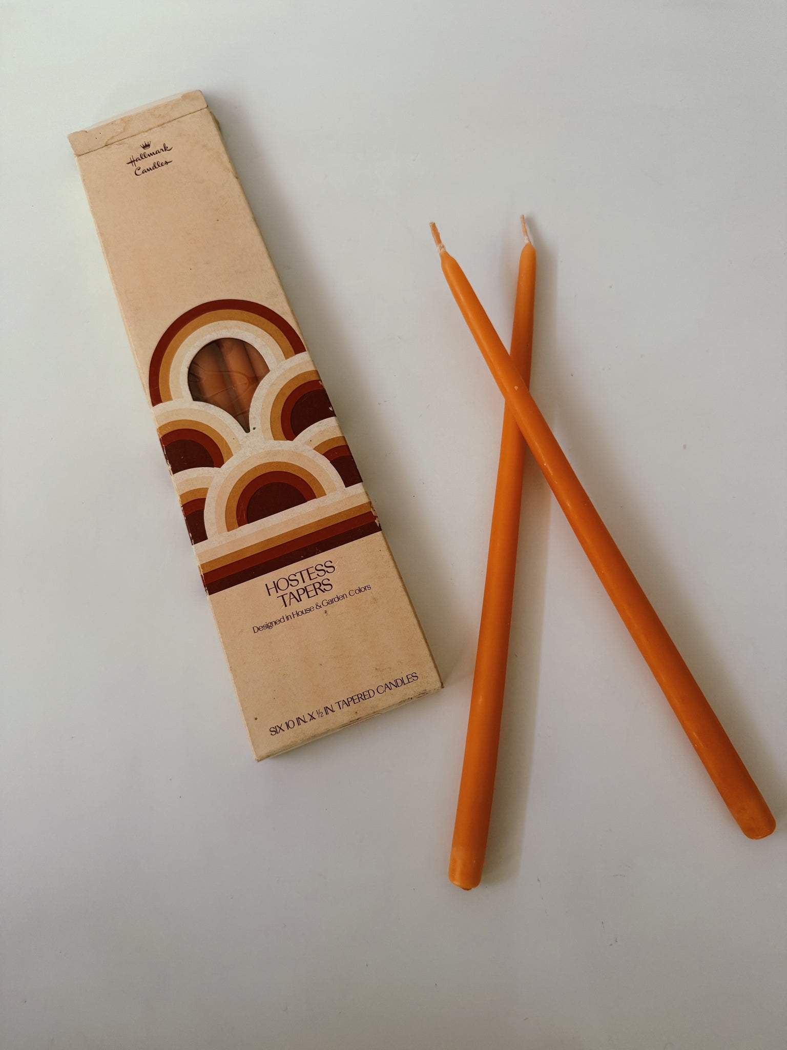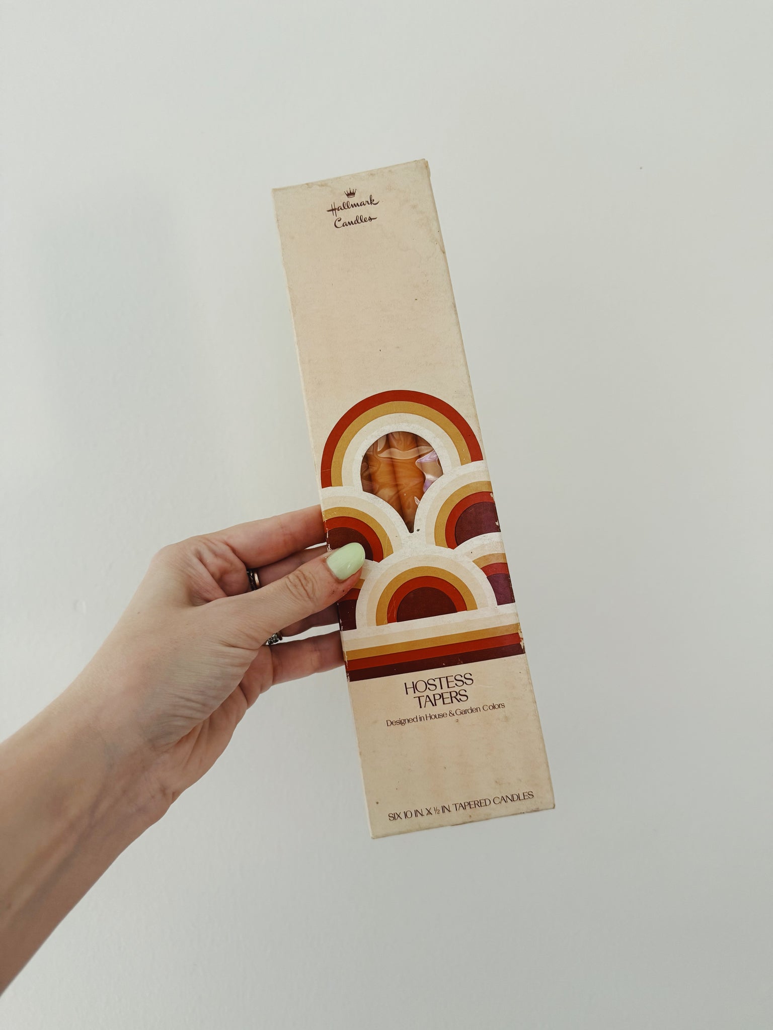 Vintage Hallmark taper candles. In a very pretty rust color with very cool vintage packaging!