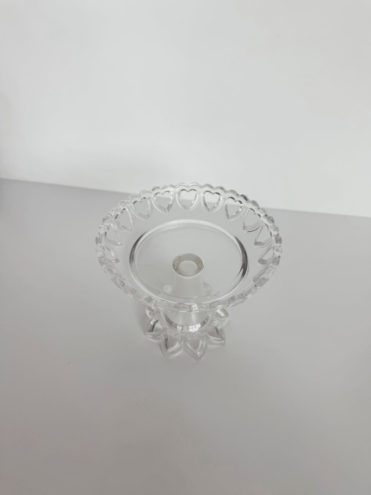 Beautiful glass pedestal dish featuring a heart cut out design. Likely created to be a cake or cupcake stand, but can be used to hold or display many objects in your home!
